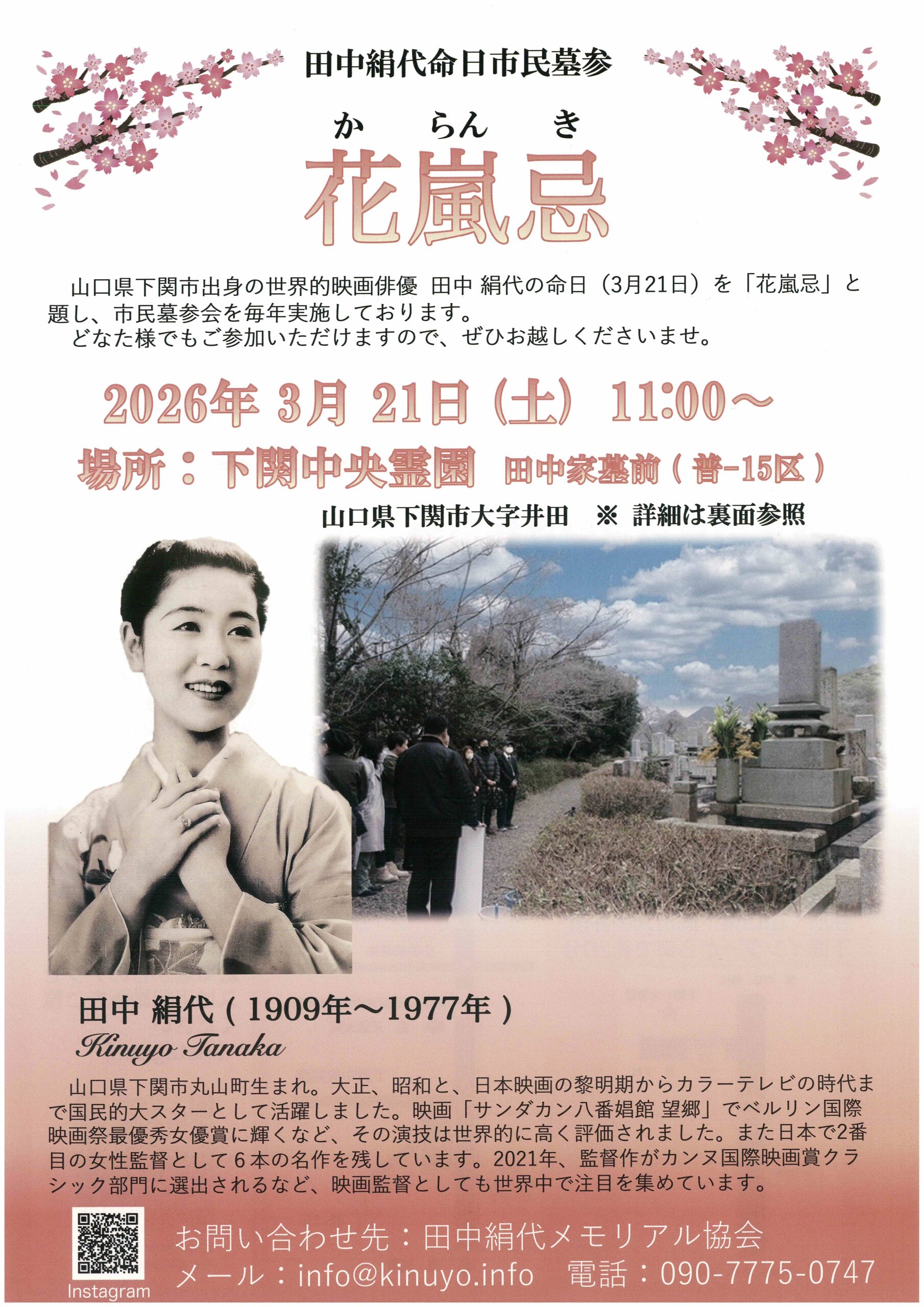 花嵐忌~田中絹代命日市民墓参2026.03.06 【主催】田中絹代メモリアル協会 【日時】2026年3月21日(土)11:00~ 【会場】下関中央霊園 田中家墓前(普-15区) 【お問い合わせ先】田中絹代メモリアル協会 MAIL info@kinuyo.info TEL 090-7775-0747