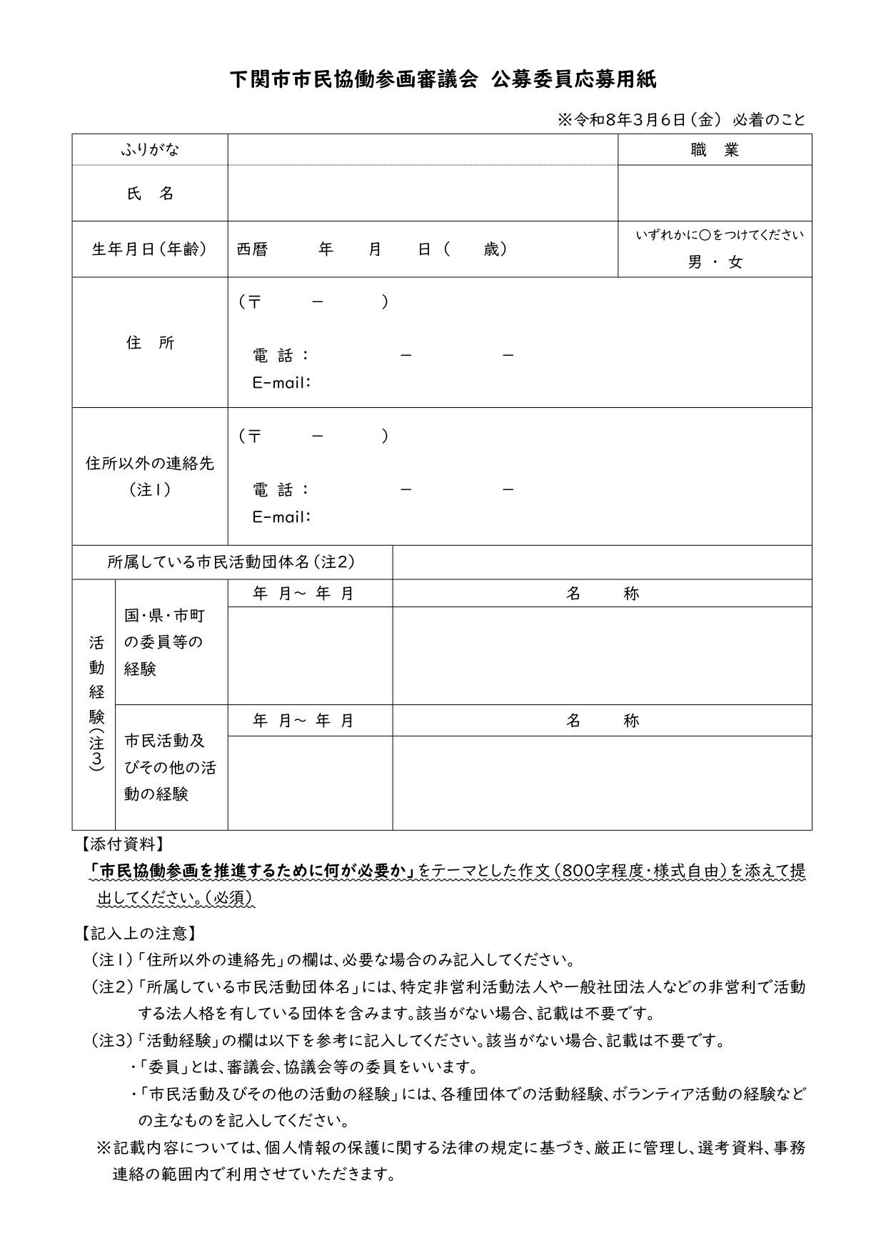 所定の応募用紙に必要事項を記入の上、「市民協働参画を推進するために何が必要か」をテーマとした作文(800字程度)を添えて、持参、郵送、Eメールのいずれかの方法で下関市市民部まちづくり政策課へ応募ください。