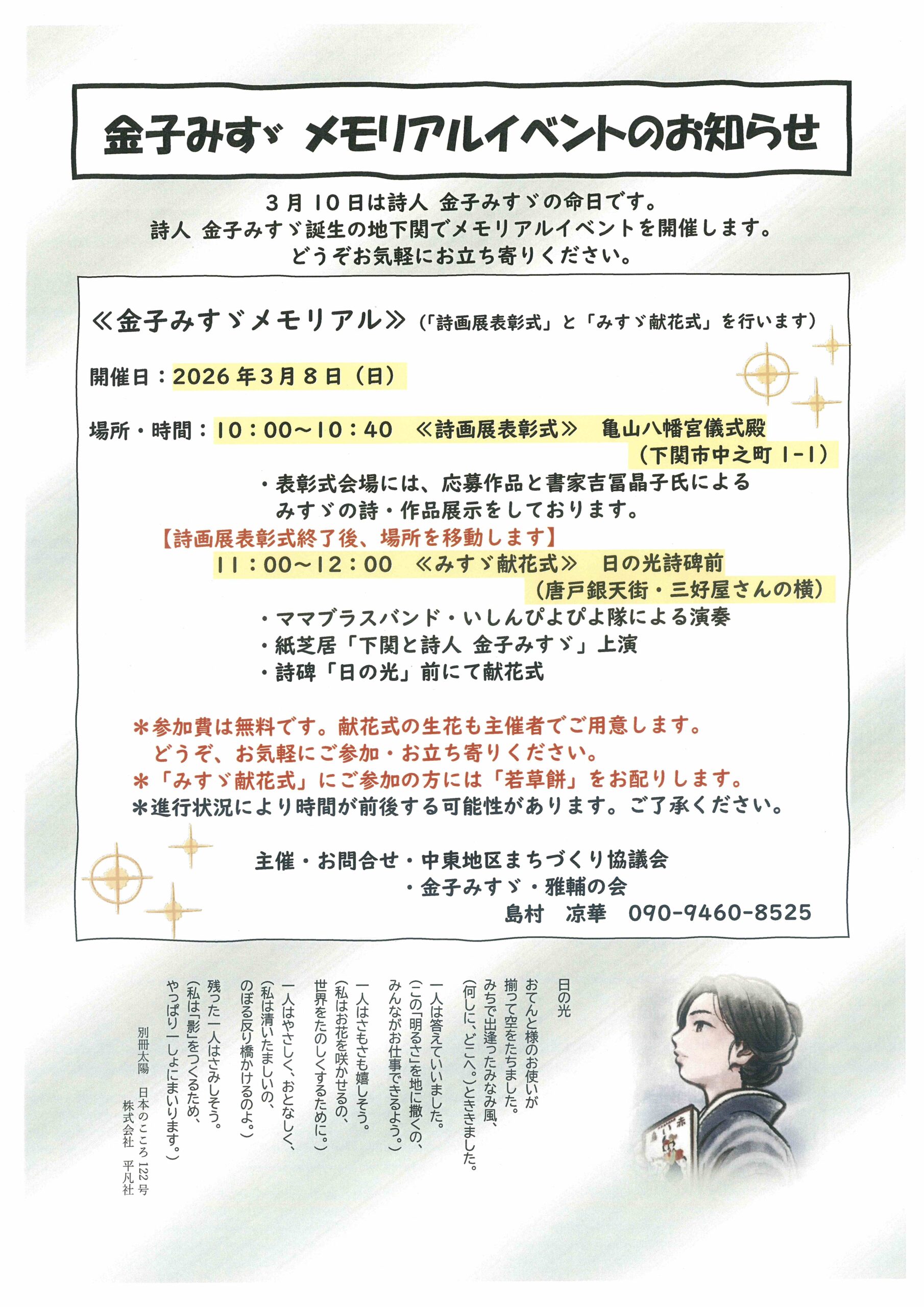 【お問い合わせ先】中東地区まちづくり協議会・金子みすゞ雅輔の会 TEL 090-9460-8525(島村)